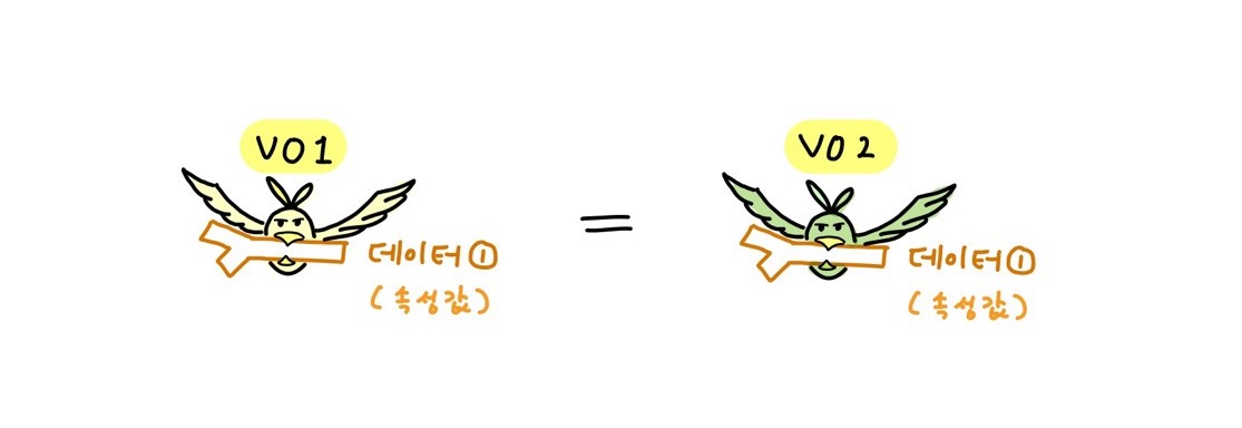 - VO는 담고있는 데이터만 같다면 서로 다른 두 객체도 같은 객체라고 본다. 아래 <그림2>에서 노랭이와 초록이는 서로 다른 새지만 물고있는 데이터만 같다면 둘은 같다고 정의하는게 VO다.