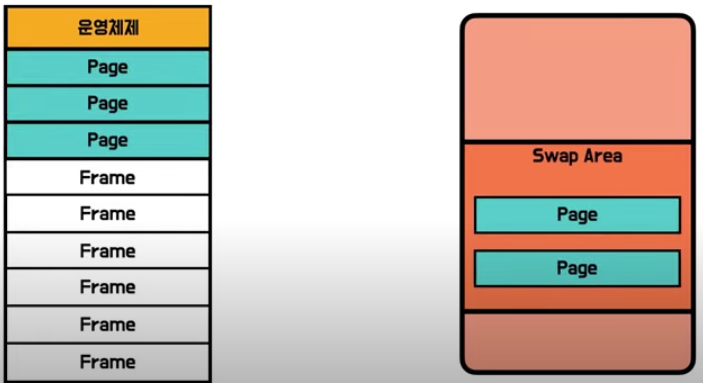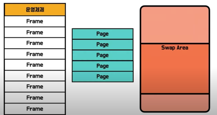 - 페이징 기법은 프로그램을 페이지 크기로 자른다. 그리고 당장 필요한 최소한의 페이지들만 Frame으로 올리고, 나머지 페이지들은 Swap File에 저장한다.