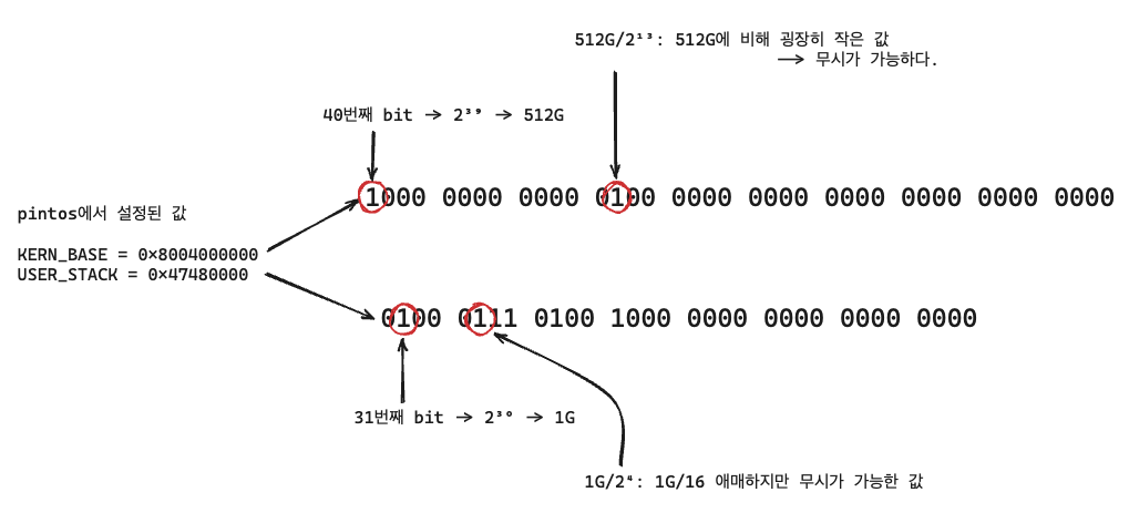 - Page Table의 크기 : page단위로 할당되고 pintos에서는 page의 크기를 4KB로 하고 있기 때문에 4KB(2¹²Byte)다.