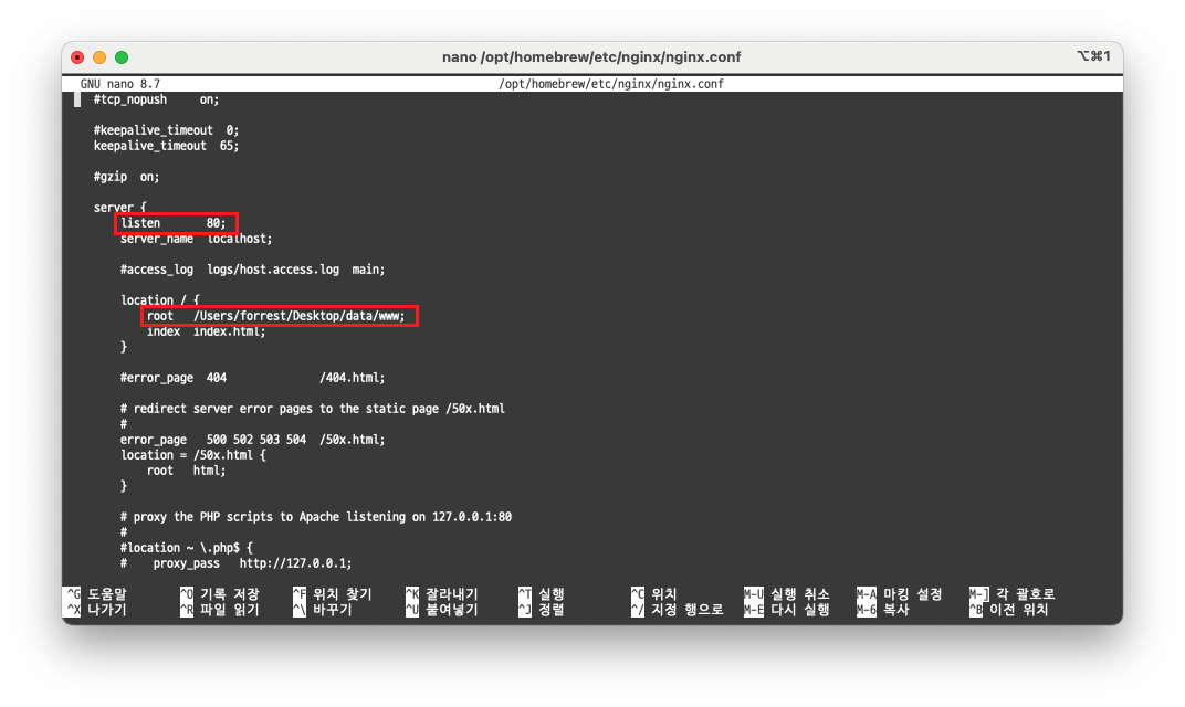 listen을 http 기본 포트 번호인80으로 수정. root를 정적 컨텐츠의 위치인/User/forrest/Desktop/data/www로 수정.
