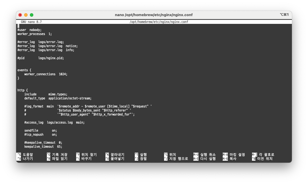 다음은 이미지는 터미널 편집기로 열어본 nginx.conf입니다. ( nginx.conf의 위치는 환경에 따라 다르지만 보통 etc/nginx에 위치해있습니다. )